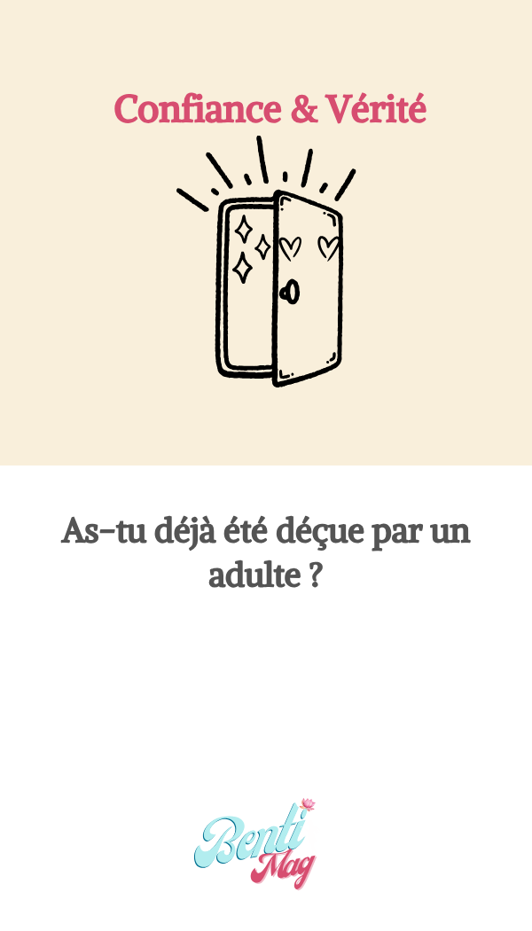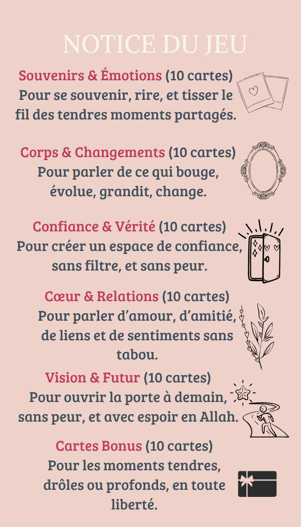 Le principe est simple : on pioche une carte, on lit la question, et on y répond si on se sent prêt(e). Chacun peut aussi poser la même question à l’autre. Ce jeu se vit partout : en marchant, dans un coin tranquille, ou le soir avant de dormir.